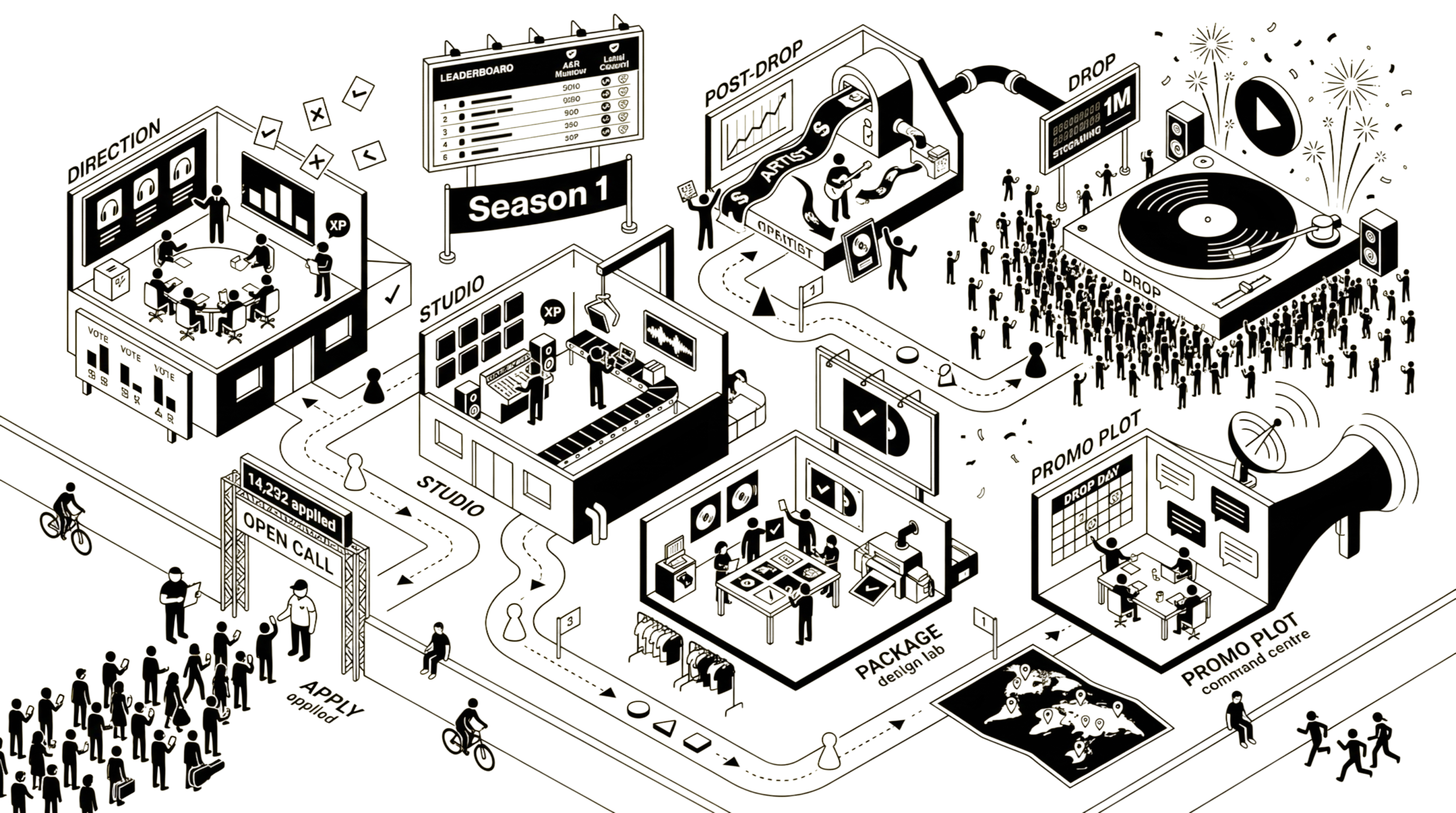 Multiple artists running at once. Seven phases per release. Every decision made by the crowd. Think fantasy football – but for the music industry. And the artists are real.
